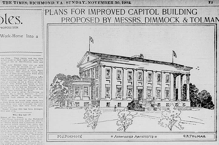 After a basic initial search, we’ve discovered George R. Tolman worked with Marion Dimmock of Richmond for a brief time in the early 1900’s.  They worked together on the renovation and wing additions at Westover plantation, as well as a proposal for an expansion and improvements to the capitol building, both in 1902.  Tolman was also a noted designer of lighthouses from Virginia Beach to New England.  We’ll look for more information on Tolman and hope to make the aquaintance of a seasoned architect who perhaps specialized in the neoclassic style.