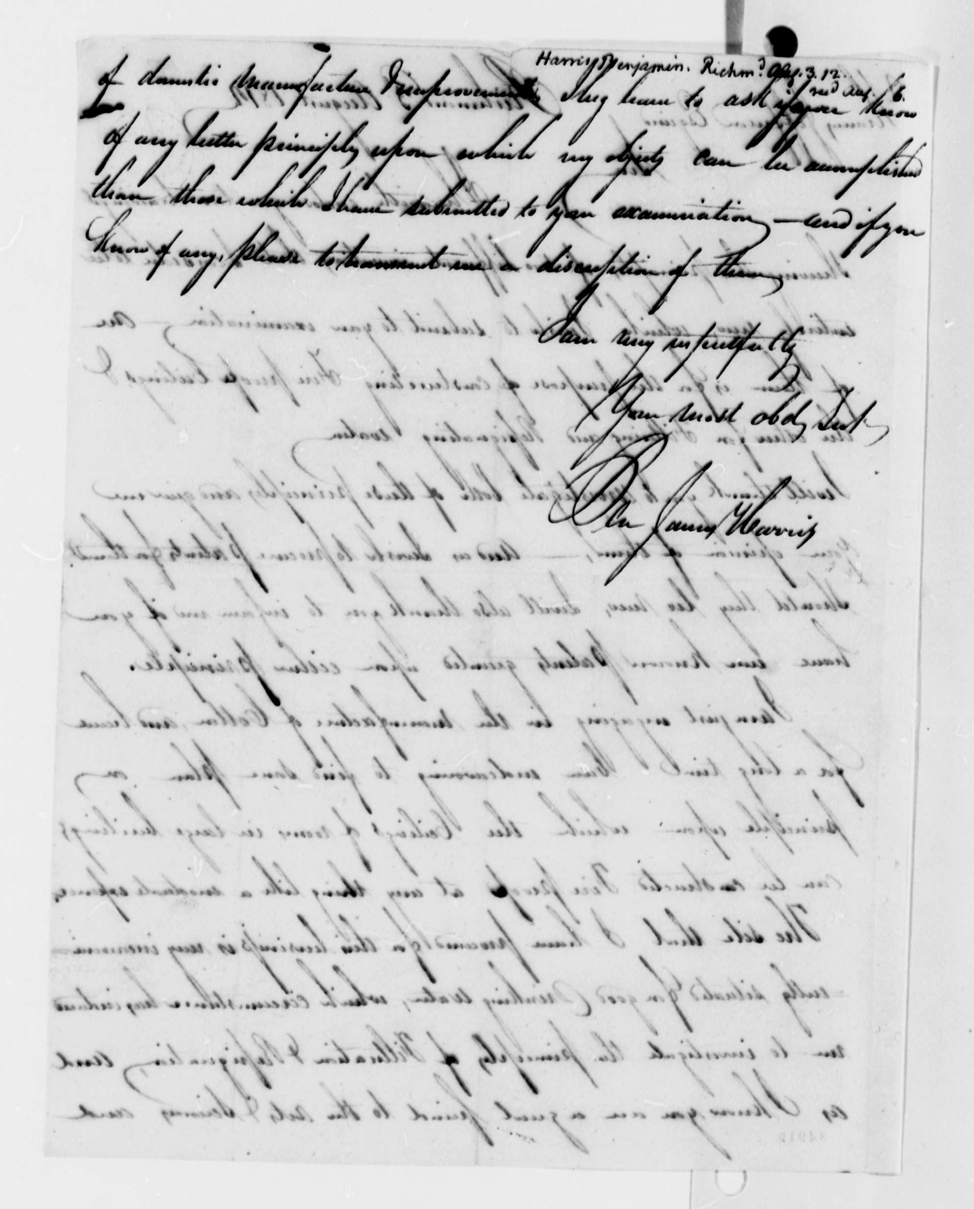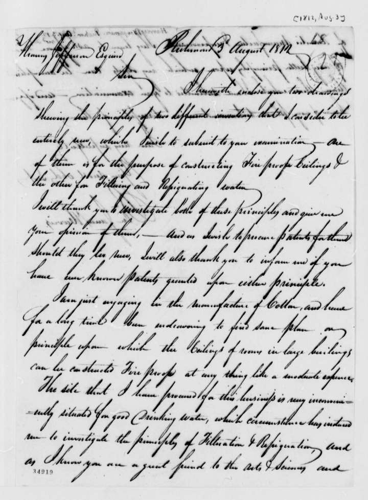 1812, Aug 3 Harris writes pantent request to Thomas Jefferson – DC? Re: Cotton & water purification (for an actual image of the letter and transcription, see below.)
