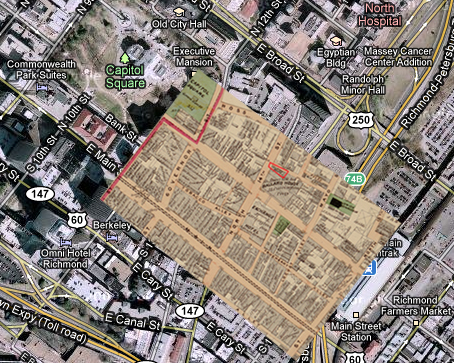 Here is an 1876 map showing the Clifton Hotel (red outline) in relation to modern day. The neighboring Ballard Hotel (just to the south of the red outline on the same block) was built in 1855, closed along with the Exchange Hotel in 1896 (after suffering from new competitor The Jefferson Hotel) and demolished around the turn of the century just prior to Clifton. When George Tolman visited the Clifton site to take the survey published in American Architect and Building News, his perspectives indicate no neighboring structures.