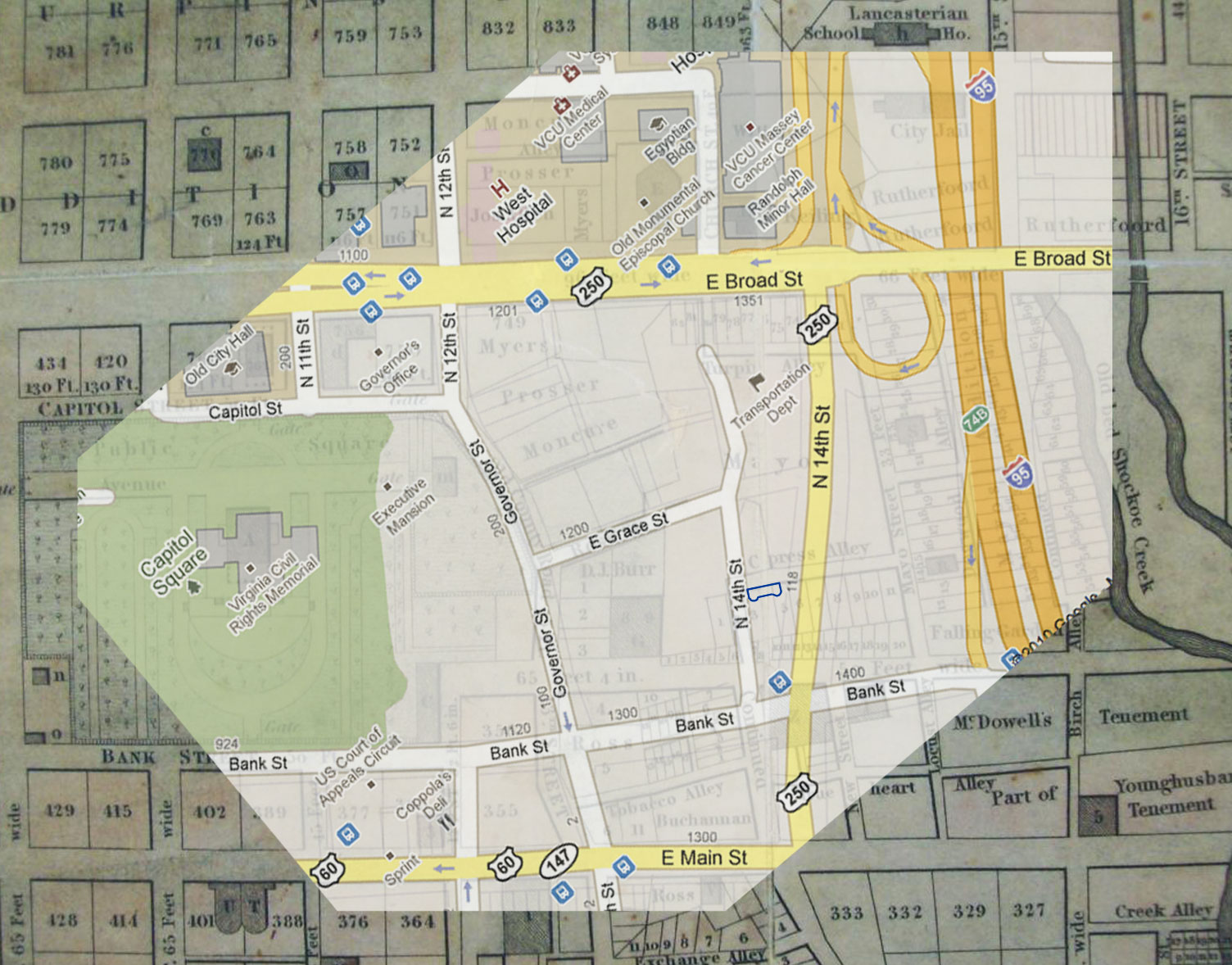 This evening I met with T. Tyler Potterfield, author of Nonesuch Place: A History of the Richmond Landscape, and Gibson Worsham, Architectural Historian at 3north and author of the blog, “Urban Scale Richmond,” for a tour of the Clifton site. We began with a brief overview of the Capitol hill and walked over to the neighboring hill — both among many “spurs” of the Shockoe Plateau — Council Chamber hill. By referencing maps from 1809, 1817 and 1835 along with overlays of Latrobe’s proposed site plan and Sanborn maps of where the built structure actually stood, we were able to approximate the original streets and alley ways as well as the buildings of interest. It was pretty exciting!
