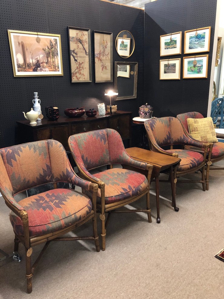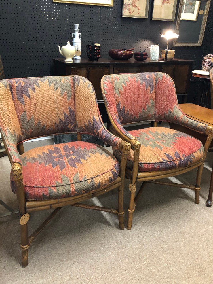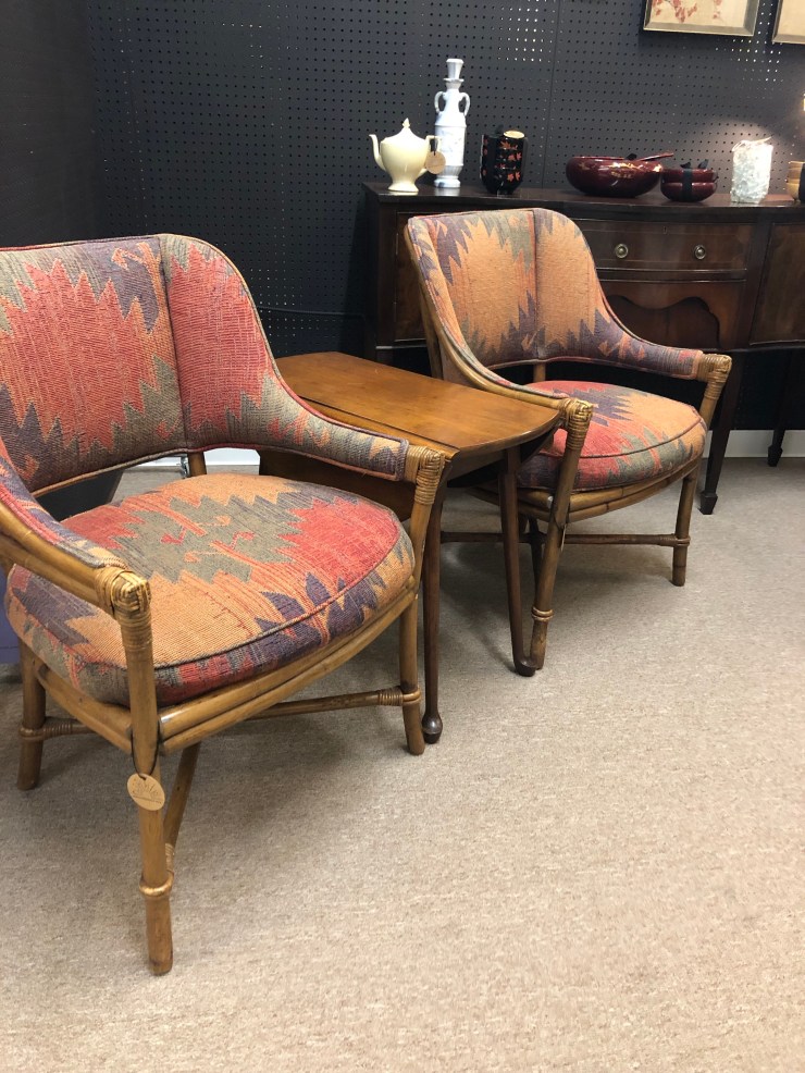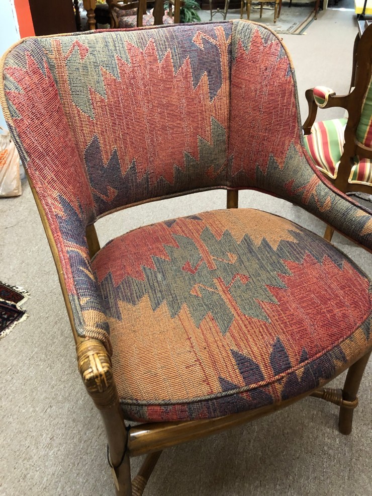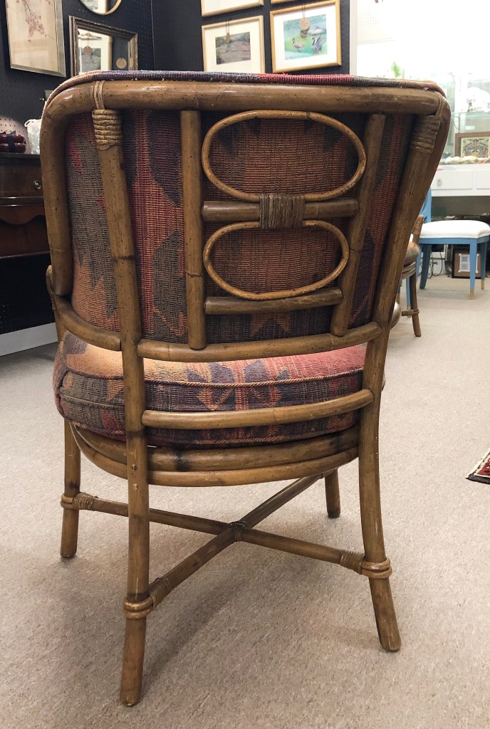 Details: Beautiful texture upholstery on Rattan chairs. Seat cushions unattached. Lovely, sturdy construction. Perfect for adding a pop of color or boho touch to a round dining table!