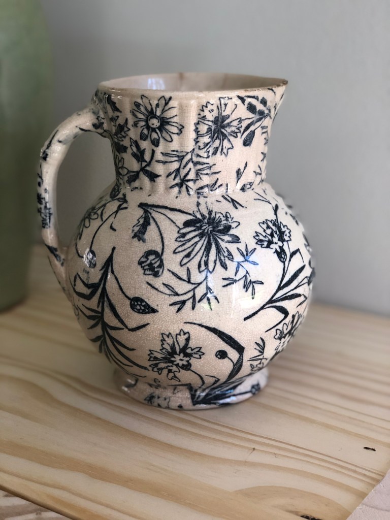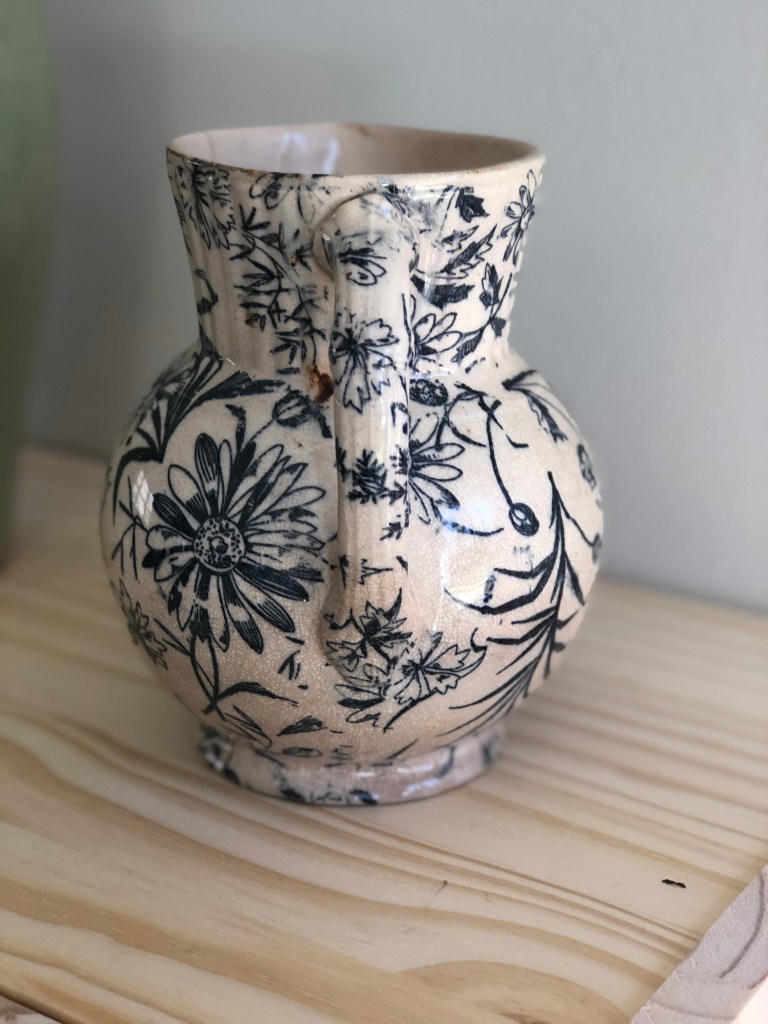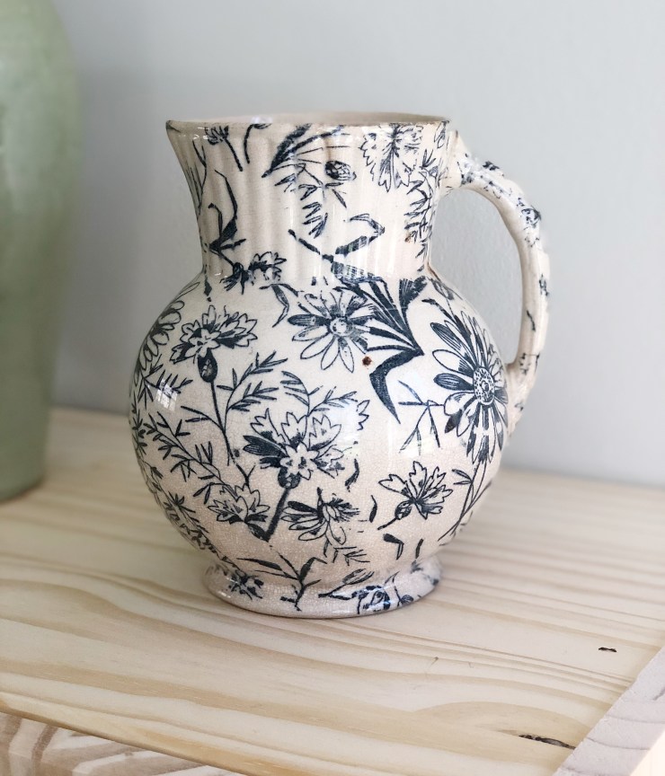 Details: Blue and cream floral motif earthenware pitcher or jug. Transfer printed pattern features a pretty assortment of grasses and daisies. Bottom features blue anchor mark of British Anchor Pottery Company Ltd, of Longton, Staffordshire, and red 7. This piece has fine craquelure throughout.