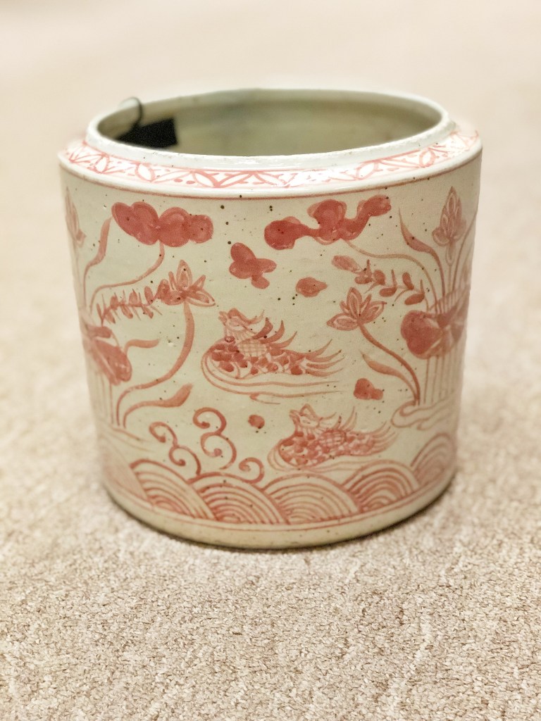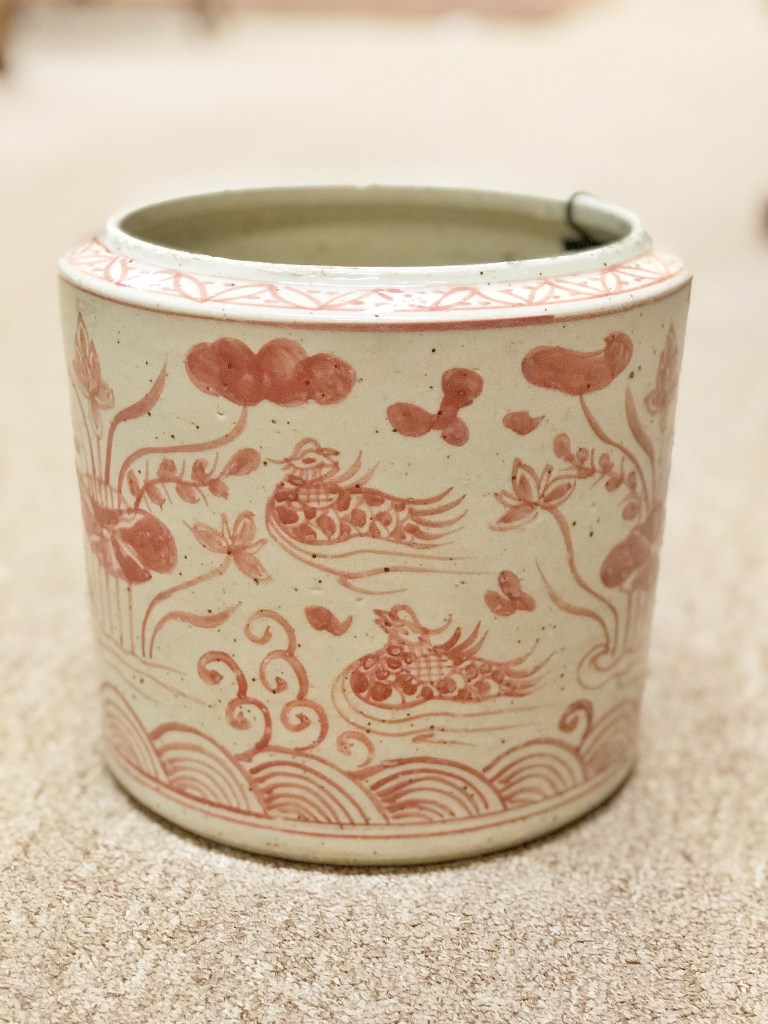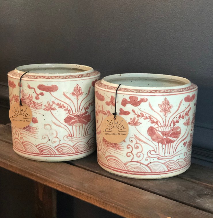 Details: Beautiful hand painted red and cream porcelain planters with a garden and water motif. These planters are heavy for their size. Obtained from an estate sale, Richmond, VA.