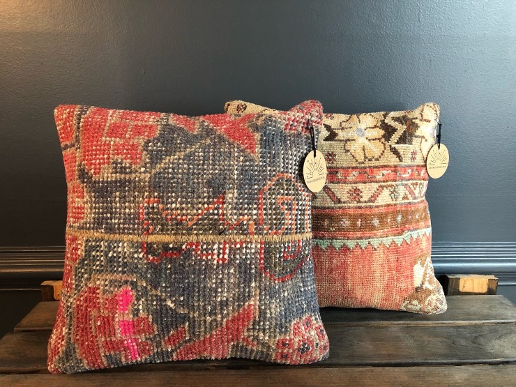 Details: Brand new Turkish rug pillow covers with cotton & form polyester inserts. Covers are made from high quality vintage handwoven Turkish Anatolian Kilims created with vegetable dyes. Zip closure.